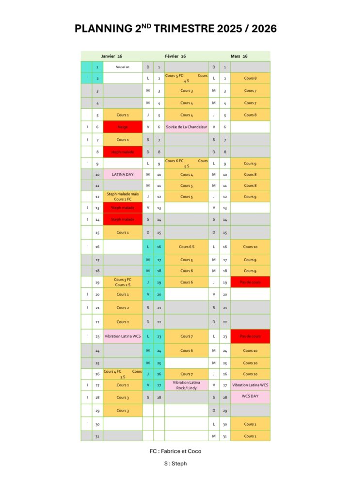 Agenda des cours et soirées
